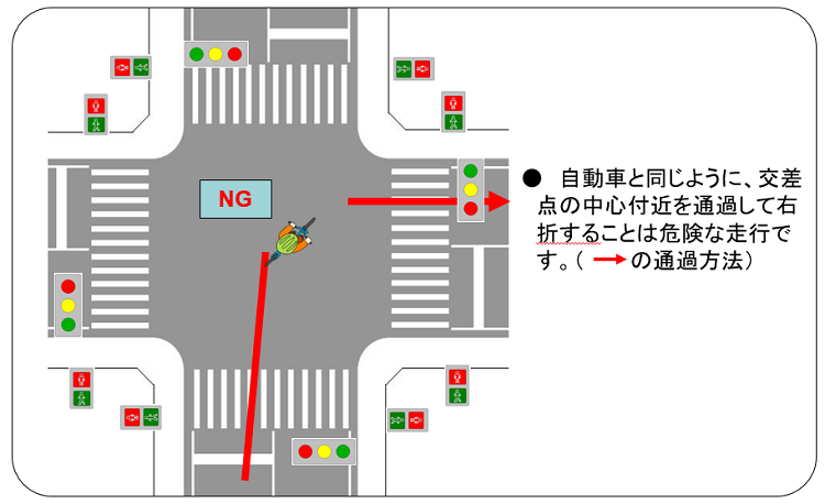 信号交差点における誤った通行例(無信号交差点でも誤りです)