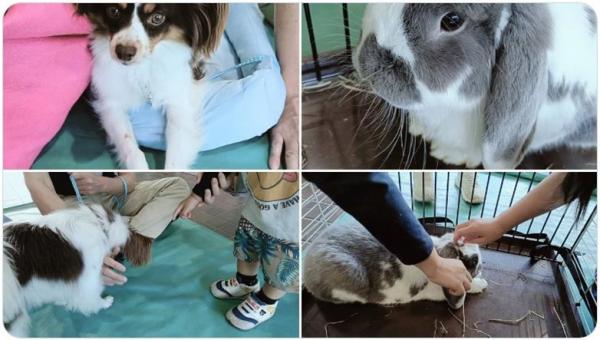 10月9日のおでかけハローアニマルは塩尻市に行ってきました。小さなお子さんと、元気な小学生がたくさん参加してくれました。「見ているだけで可愛くて癒される」と言ってもらって、おすまし顔のふれあい犬の「チョコ」とうさぎの「ぽてまる」です。#小諸#ハローアニマル#塩尻市#居場所#ふれあい