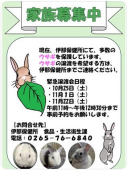 #伊那保健所で#うさぎの新しい飼い主さんを募集しています。伊那合同庁舎内で10月25日、11月1日、11月22日の午前11時から12時30分までうさぎの#譲渡会も開催します。譲渡を希望される方は伊那保健所食品・生活衛生課(TEL:0265-76-6840)までご連絡ください。事前予約をお願いします。