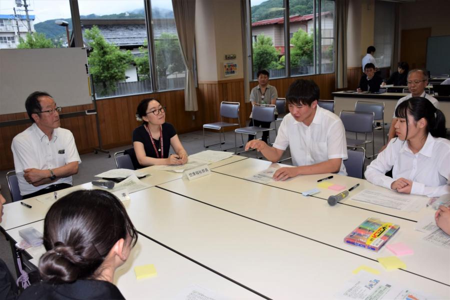 【少子化対策意見交換会】 県が策定する少子化・人口減少対策戦略に地域の声を反映するため、本校の学生と副知事、健康福祉部長の意見交換会が行われました。最後に副知事に認知症啓発グッズである学生手作りの「ロバ隊長マスコット」をプレゼントしました。 |