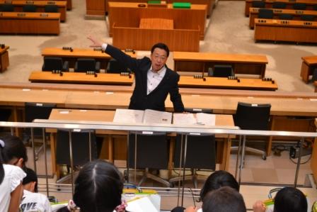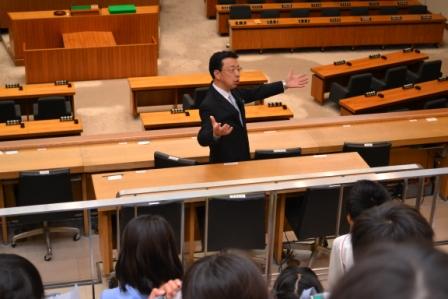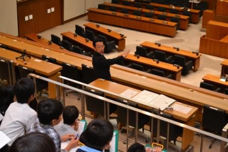 県庁見学に訪れた佐久市の小学生に小島副議長が議場説明を行いました