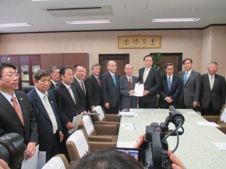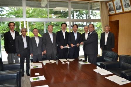 青山中津川南木曽県際道路改修促進協議会長(中津川市長)から要望書を受け取る正副議長