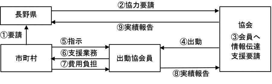 県は、市町村から協定に基づく要請を受けた場合、協会へ協力を要請します。県から要請を受けた協会は、市町村と連絡を取りながら、必要な支援業務を行います。