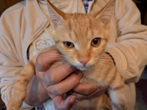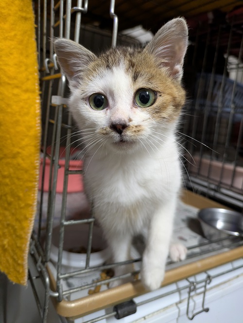 07-67c…甘えてきて抱っこできますが、あまり長く抱っこできません。食べるのが遅くて他の2匹に食べられることが多く、体格も他の2匹より小さめ。R7.12.30お腹の虫陰性。