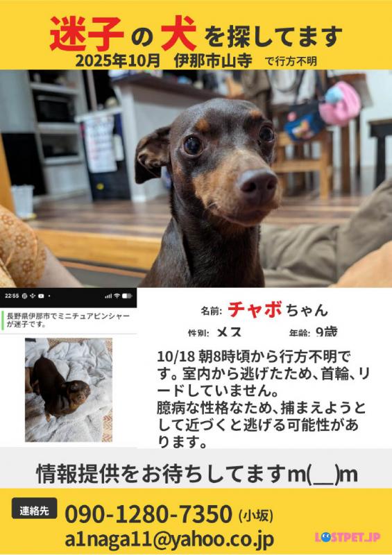 2.行方不明状況:令和7年10月18日、朝8時30分ごろに伊那市山寺の自宅から逸走
