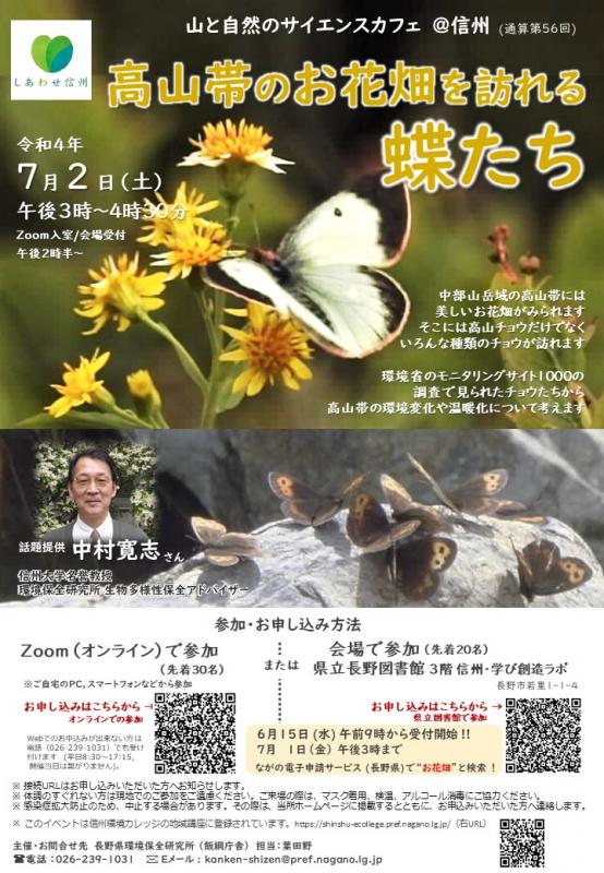 今回の山カフェは、県立長野図書館とオンラインでのハイブリッドで開催しました。県内の高山帯でみられる蝶の研究成果から、温暖化の影響について考えました。県内外からも多くの方にご参加いただき、また、多くの質問をいただきました。