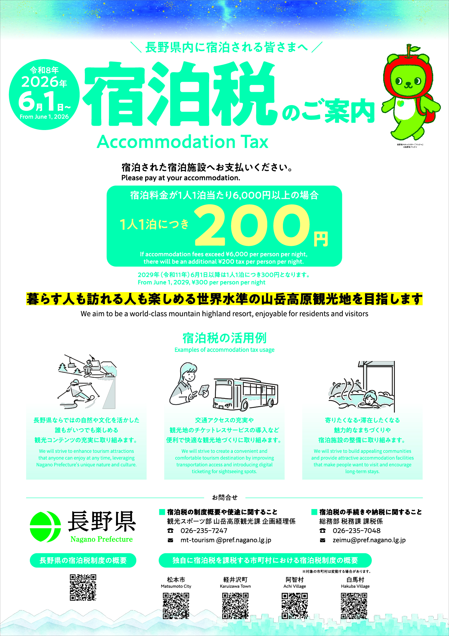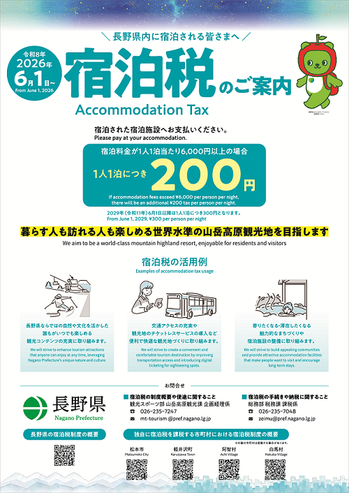 ホーム > 県政情報・統計 > 組織・行財政 > 組織・職員 > 長野県の組織一覧(本庁) > 観光スポーツ部山岳高原観光課紹介 > 長野県宿泊税