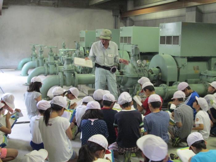【送水ポンプ室】ポンプ1台で1時間に25メートルプール2つ分の水を90メートルの高さまで押し上げます。ポンプはぜんぶで4台あります。 |