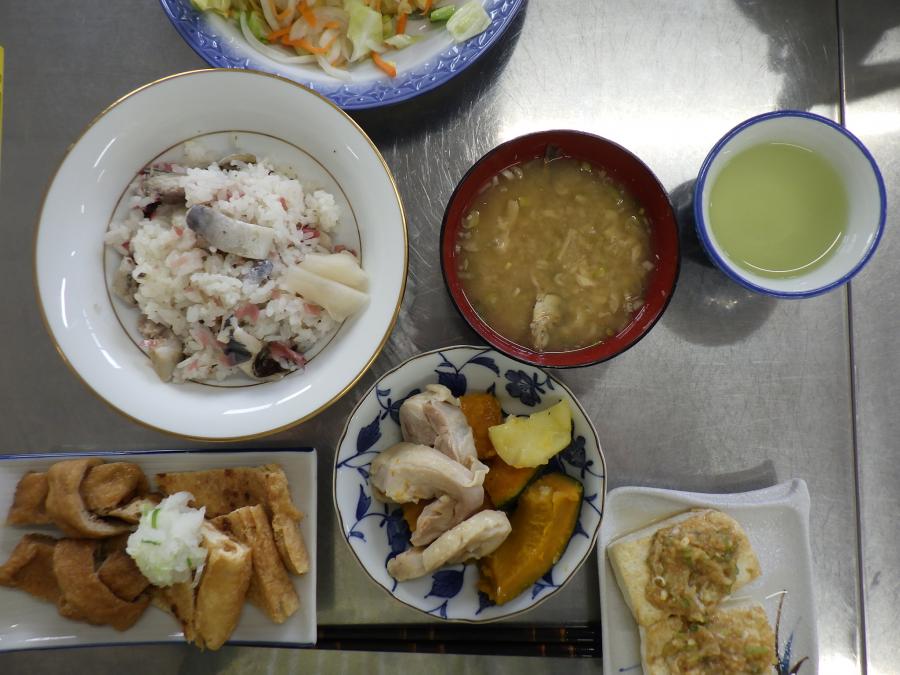 【献立】鯖ちらし寿司 油揚げのみそ漬け焼き 蒸しハム とうふ田楽 大判油揚げの結び煮物 味噌汁 キャベツのもみ漬け