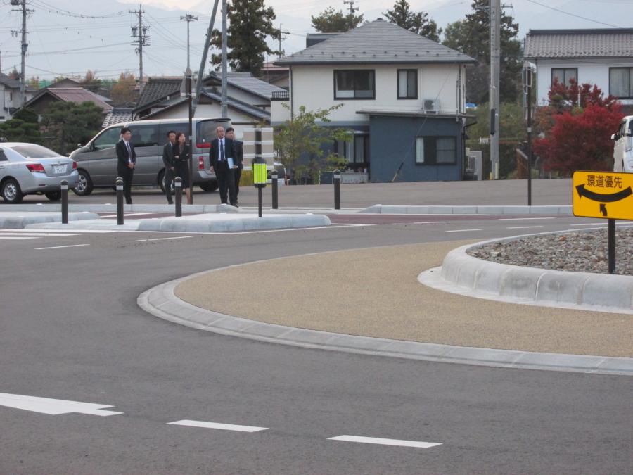 山本委員長、柳平委員は、10月に新規開店した大型ショッピングモール周辺の渋滞緩和対策として実施した交通規制(新規設置の信号機、ラウンドアバウト)を視察しました。