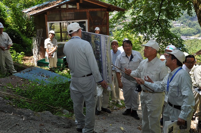 浅川ダム建設及び地すべり対策工事を行っている場所で、職員からダムの概要や機能、工法、進ちょく状況などについて説明を聞いた後、浅川に沿って土手を移動しながら視察。