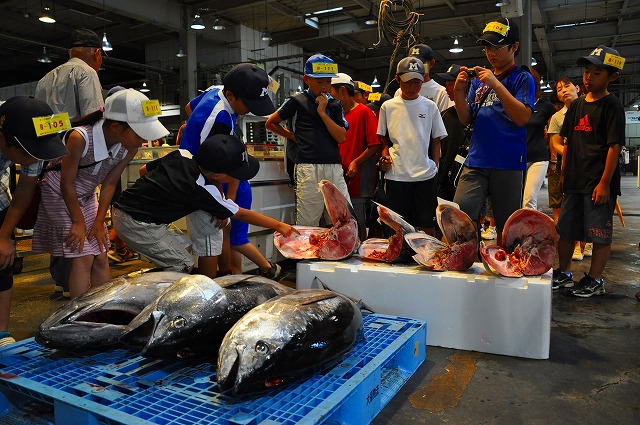 青果物や魚介類などが大量に並ぶ市場内を案内してもらい、参加した約50人は市場の仕事を体感しました。