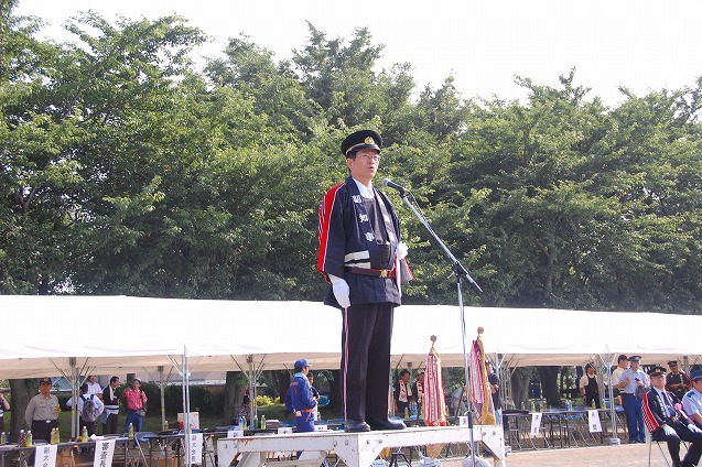開会式のあいさつで板倉副知事は「日本の良いものが次々と失われる中、消防団という素晴らしいものを、団員の皆さんの地域を守る活動で次世代に残していってほしい」と激励。県内各地区から選出された38チームが競技に臨んでいました。