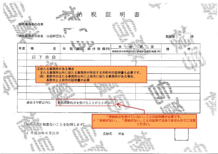 従たる事務所がある場合、全ての従たる事務所が所在する市町村の納税証明書が添付されている。 |