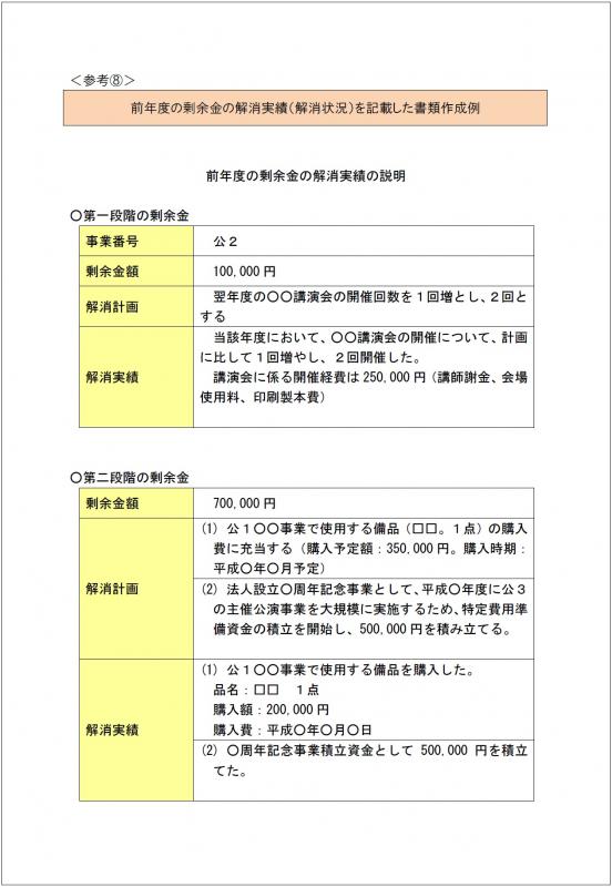 前年度の事業報告で剰余金が発生していた場合、剰余金の解消実績(解消状況)を記載した書類(任意様式)が添付されている。 |