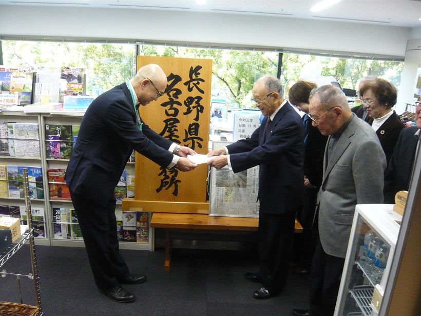 11月12日、長野県名古屋事務所にて名古屋長野県人会さまから「令和元年台風第19号災害義援金」へご寄付がありました。