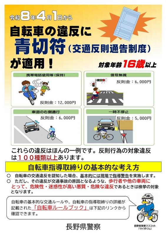 令和8年4月1日施行の改正道路交通法により、自転車の違反に対して交通反則通告制度(青切符)が導入されます。