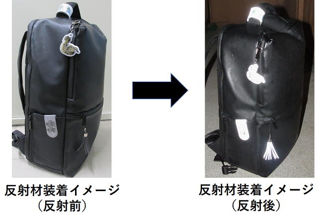 夜光反射材を活用すると、下の写真のように自動車のライト等の光を反射し、運転者などに早めに自分の存在を知らせることができます。