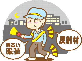薄暮や夜間に歩くときは、運転者から見えやすいように明るい目立つ色の衣服を着用した上、靴や衣服、カバンなどに夜光反射材を装着し、交通事故に遭わないようにしましょう。