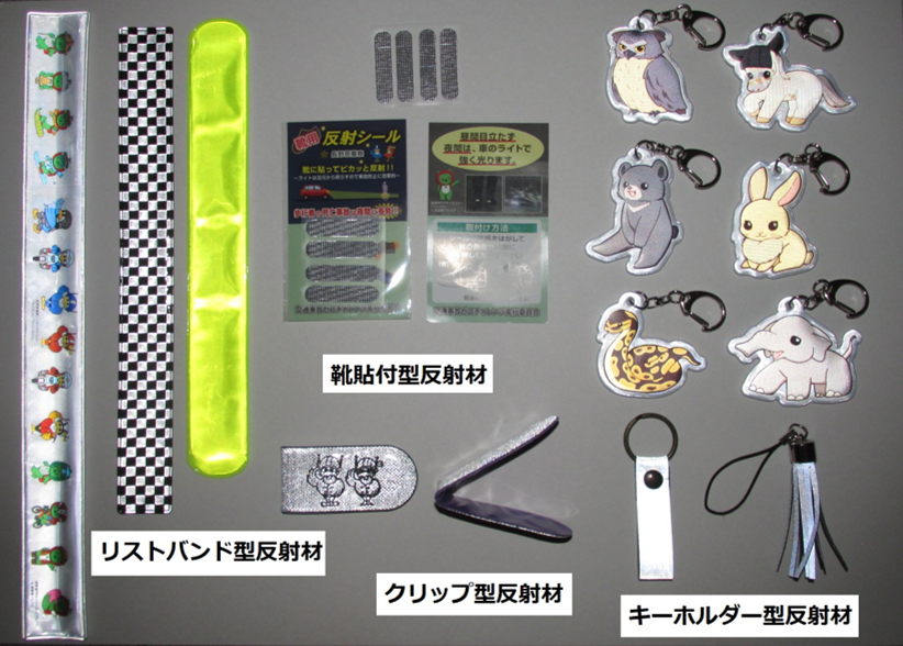 夜光反射材には、下の写真のように「リストバンド型」「キーホルダー型」「靴貼付型」「クリップ型」など多くの種類があり、ホームセンターやインターネット通販のほか、一部警察署窓口でも販売しています。