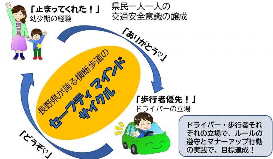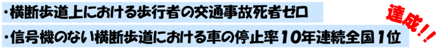 本プロジェクトの目標の一つである「信号機のない横断歩道における車の停止率10年連続全国1位」を達成することができましたのも、県民の皆様が、日頃から交通安全意識を高く持ち続け、横断歩道に関わる交通ルールを遵守して、安全運転を実践していただいた結果であり、心より感謝申し上げます。