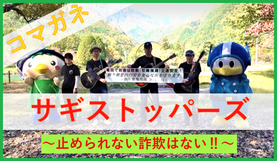 この社会から詐欺被害をストップさせるため、駒ケ根警察署の音楽ユニット『コマガネ・サギストッパーズ』が、詐欺被害防止啓発動画を制作。駒ヶ根市PRキャラクターの「こまかっぱ」、地元の養命酒製造株式会社のマスコット「ビンくん」と共に詐欺被害防止を呼び掛けています。代表曲の『わたしはだまされない』を聴いて詐欺をストップさせましょう!(YouTube県警公式チャンネル)