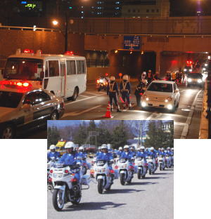道路(どうろ)を安全(あんぜん)に通行(つうこう)できるように交通(こうつう)のきまりやマナーを指導(しどう)したり、交通違反(こうつういはん)をとりしまったりしているよ。交通事故(こうつうじこ)の現場(げんば)にも行(い)くよ。