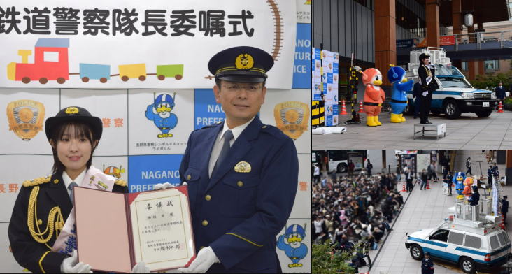 10月25日、長野県出身の声優でアーティストの降幡愛さんを一日鉄道警察隊長としてお招きし、長野駅前で防犯啓発イベントを開催しました。当日は多くの皆様に来場いただきイベントは盛大に行われました。