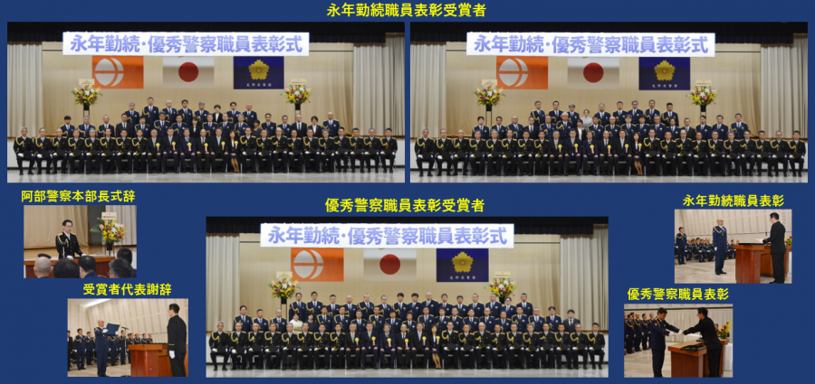 10月23日、県庁講堂で「令和7年永年勤続・優秀警察職員表彰式」が開催されました。勤続30年の警察職員49名、優秀警察職員36名が、阿部警察本部長から「警察本部長賞詞」を授与されました。