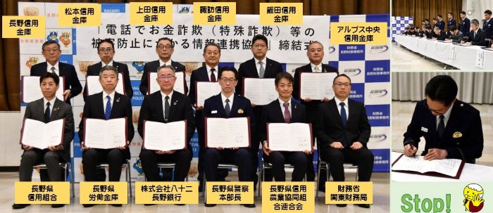 長野県警察は、悪質・巧妙化する電話でお金詐欺等の被害防止及び早期検挙に向け、1月29日、本県に本店を置く24金融機関と「電話でお金詐欺(特殊詐欺)等の被害防止にかかる情報連携協定」を結びました。