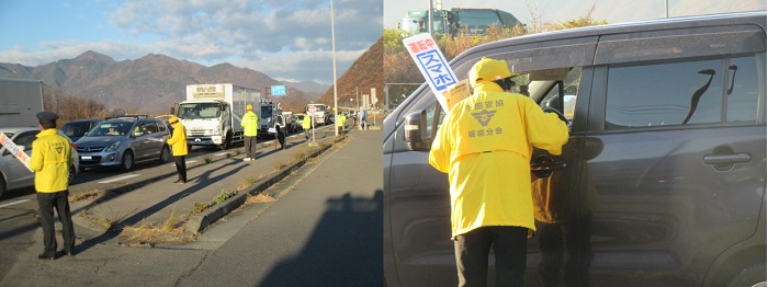 夏の交通安全やまびこ運動に併せ関係機関の皆さんと、道の駅「花の駅千曲川」及び野沢温泉村中尾駐車場で交通事故防止を呼び掛ける交通安全啓発活動を行いました。
