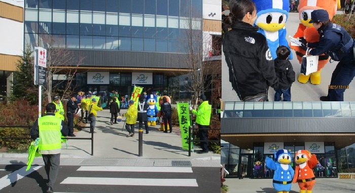 長野中央警察署と須坂警察署は、イオンモール須坂で交通事故防止のための街頭啓発活動を実施しました。ライポくん・ライピィちゃんも参加して、来店された皆さんに交通安全を呼び掛けました。
