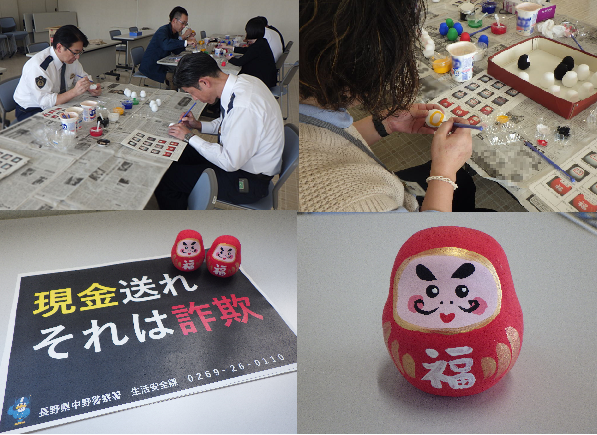 管内の安全・安心を願い、地域の特色を生かした「防犯だるま」を署員一丸となって製作。「防犯だるま」は防犯の啓発活動等で配布します。
