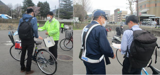 JR長野駅東口駐輪場で、4月1日から自転車の交通違反に対する青切符適用についての啓発活動を行いました。ルールを守って乗りましょう!