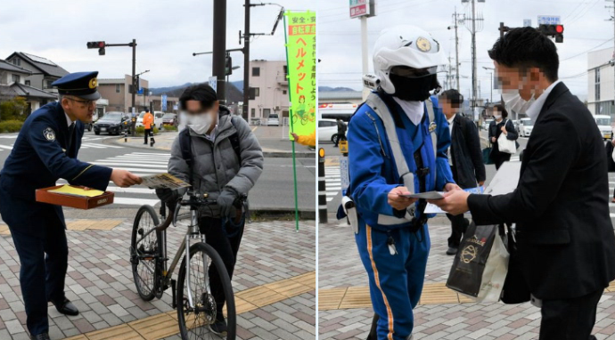 4月1日から自転車の交通違反に対する取締り制度が変わりました。千曲警察署は、関係機関・団体と共に、千曲市役所前で、自転車への青切符導入を周知する街頭啓発活動を実施しました。