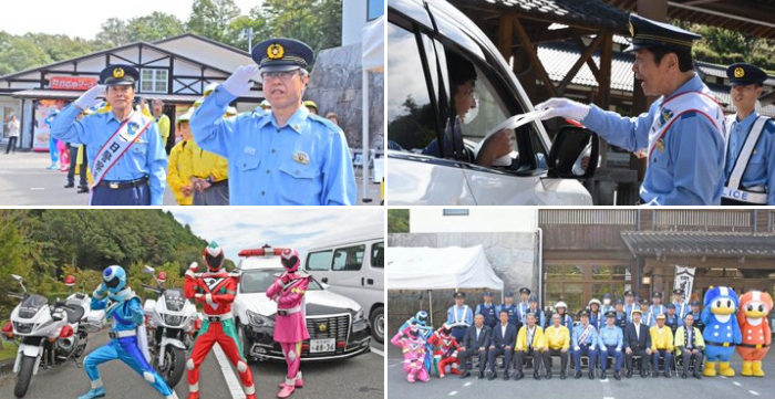 下條村出身の峰竜太さんを一日警察署長にお招きし、道の駅信濃路下條そばの城で、秋の全国交通安全運動出発式と交通事故防止を呼び掛ける街頭啓発活動を行いました。