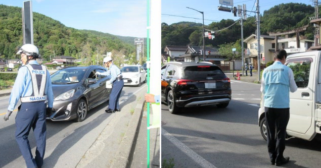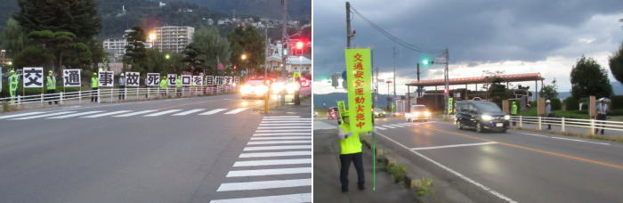 諏訪交通安全協会、諏訪市と協働して、湖岸通り五丁目交差点で人波作戦を実施し、ドライバーの皆さんに交通事故防止を呼び掛けました。
