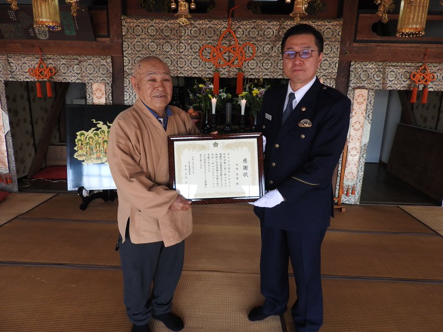 長年にわたり、地域の防犯意識の向上を図り安全・安心なまちづくりに貢献されている安養寺の住職、田嶋英俊さんに感謝状を贈呈しました。