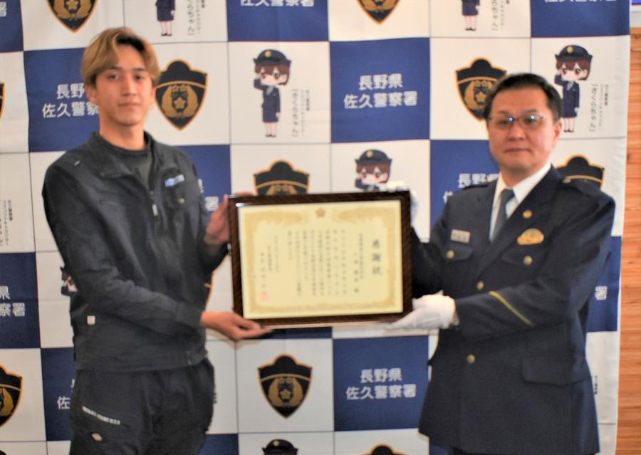 佐久市内で、道路脇に倒れていた高齢女性を早期に発見・保護し迅速的確に救助活動を行った、高重建設工業株式会社社員に感謝状を贈呈しました。