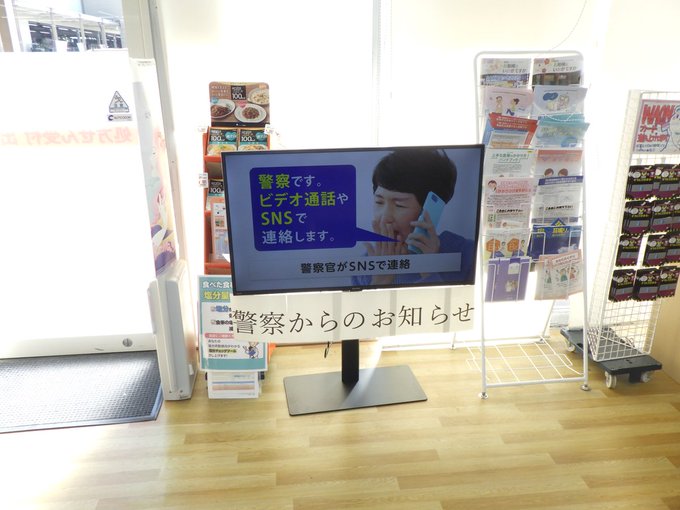 佐久市のウエルシア佐久インターウェーブ店の協力を得て調剤コーナーに放映用モニターを設置し、電話でお金詐欺被害防止啓発動画の放映を開始しました。
