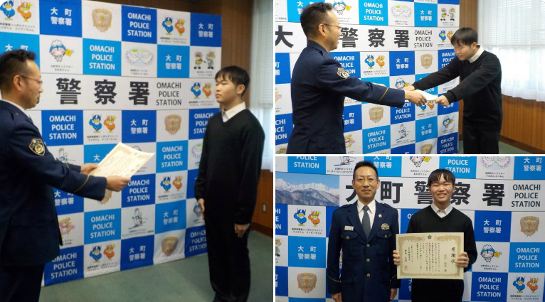 大町市内において、道に迷っている高齢者を発見・保護し、警察に通報をした男子高校生に感謝状を贈呈しました。
