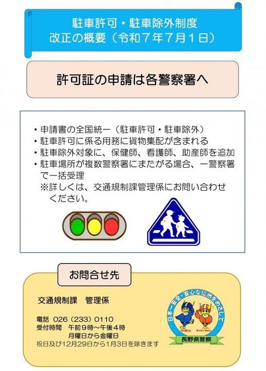 駐車しようとする場所を管轄する警察署、又は長野県警察本部交通部交通規制課(電話:026-233-0110)