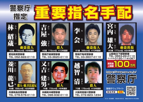 指名手配被疑者によく似た人を見掛けたといった情報など、どんなわずかなことでも結構ですので、警察に通報していただくようお願いします。