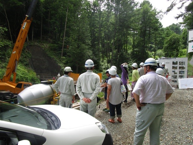 砂防堰堤工事を実施中の現場に移動し、工事の状況を見ていただきました。 堰堤のタイプや道路の復旧方法、今後の工事の内容について説明を行いました。 砂防堰堤は、8月下旬の完了を目指し、工事が行われています。 |