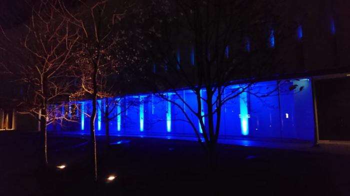 伊那中央病院の壁に青いイルミネーションを飾るほか、啓発コーナーを設置しました。